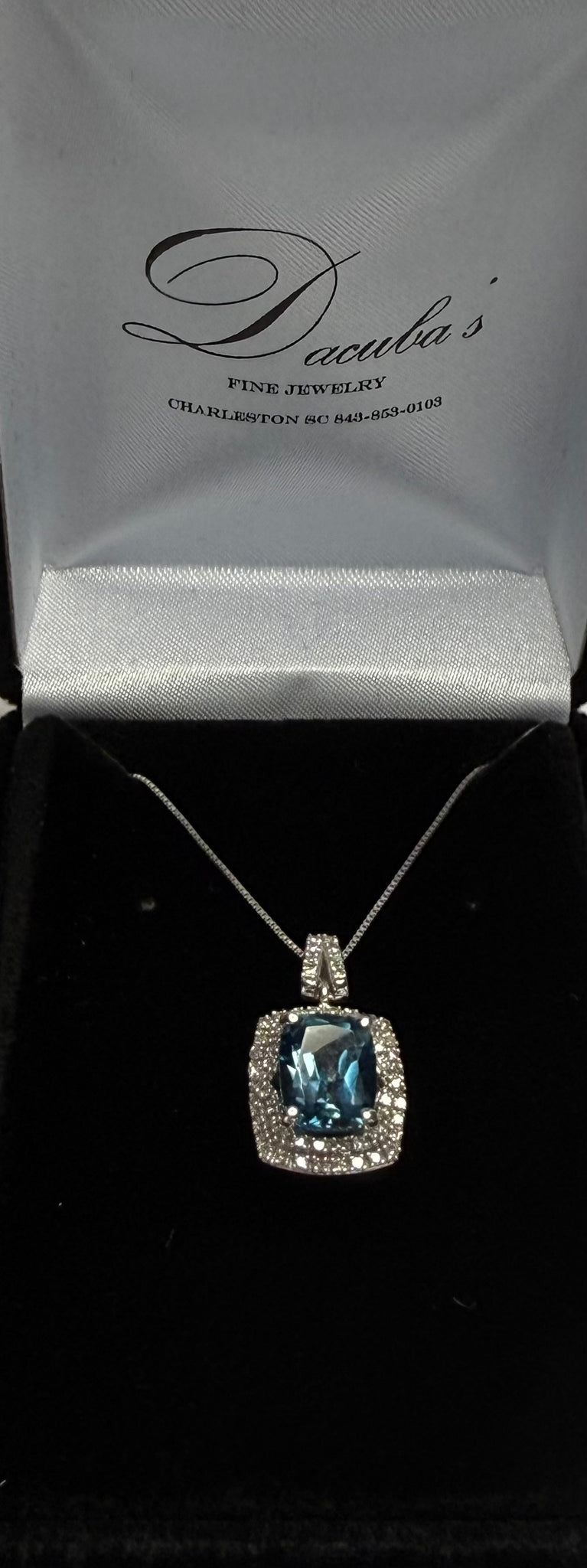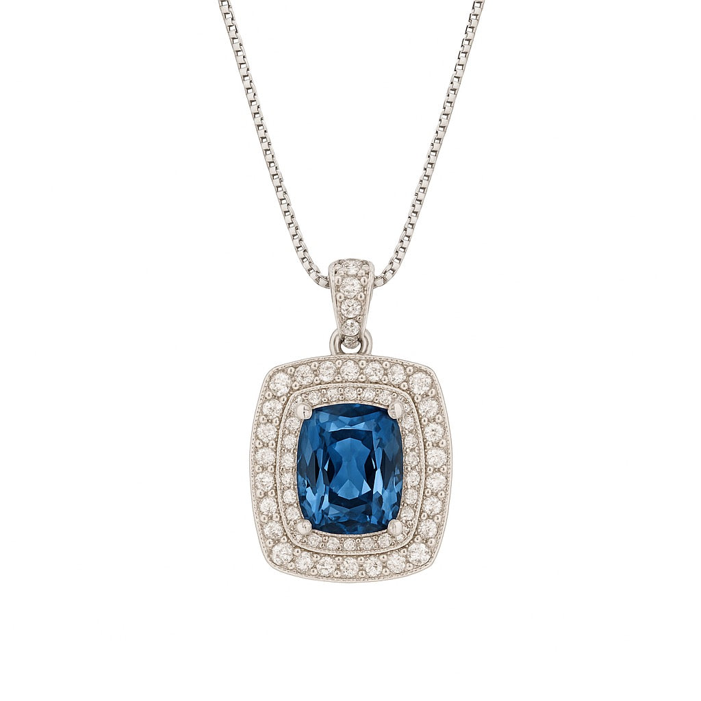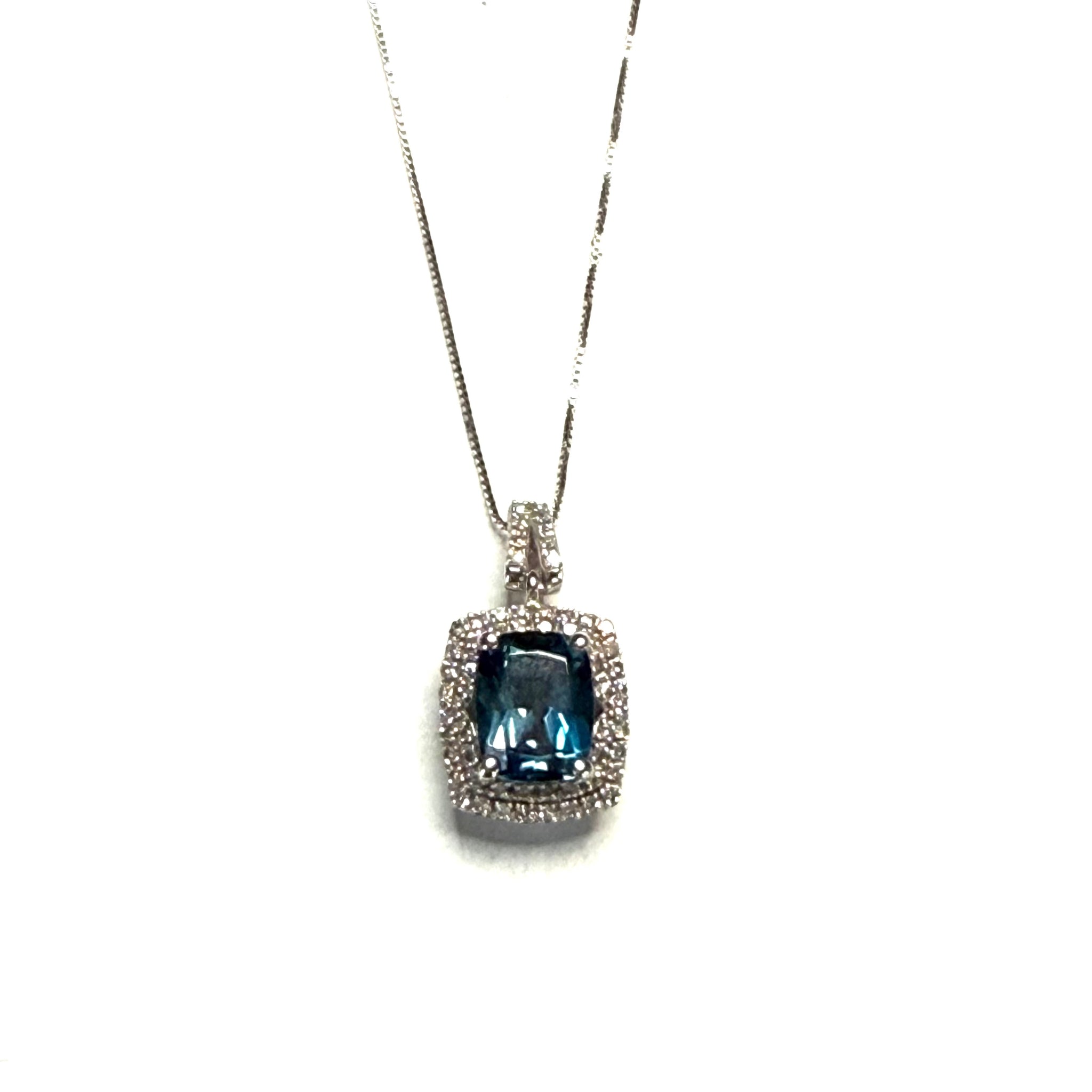 Crafted in 14KT white gold, this pendant features a natural cushion-cut London Blue Topaz gemstone, surrounded by a double halo of natural micro pavé diamonds. The rich deep blue of the topaz paired with the fine diamond detailing creates an elegant, refined design with timeless appeal