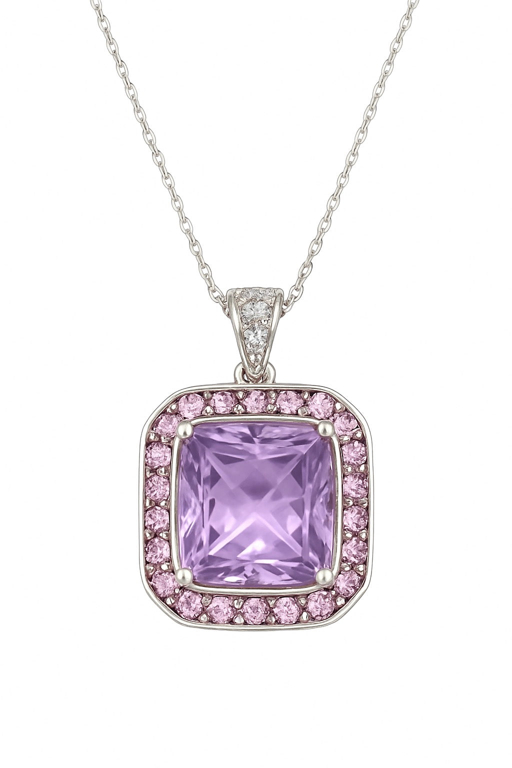 Handcrafted in 14KT white gold, this necklace showcases a natural emerald-cut Amethyst framed by a halo of natural pink sapphires. The pairing of pink and lavender tones creates an elegant, refined design suited to both everyday sophistication and special occasions.