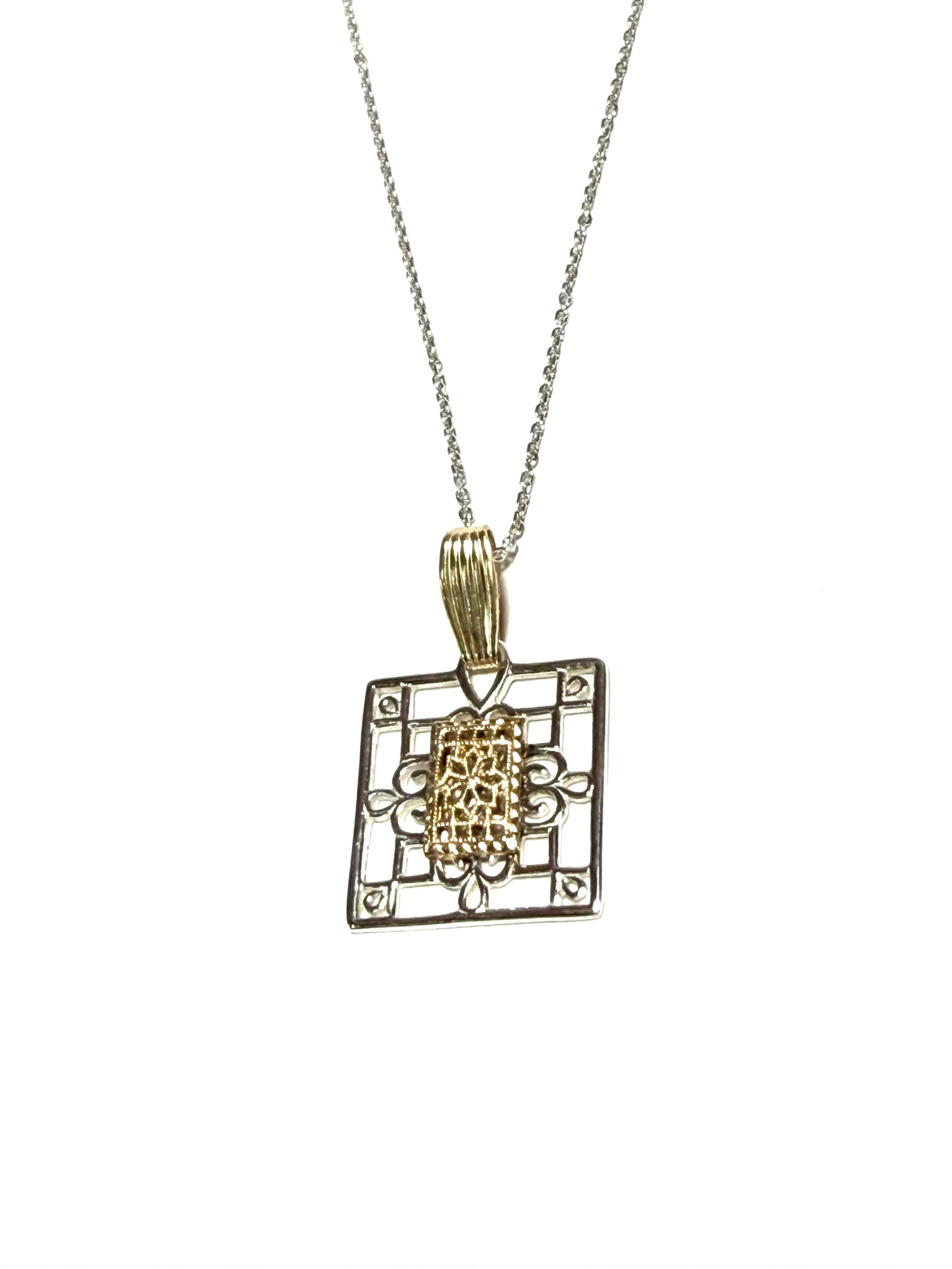 This Square Southern Gate necklace showcases signature sterling silver scrollwork with a filigree gold filled accent at the center and bail. Inspired by Charleston’s historic iron gates, the mixed metal design offers warmth within a timeless architectural silhouette. A distinctive piece with lasting elegance.