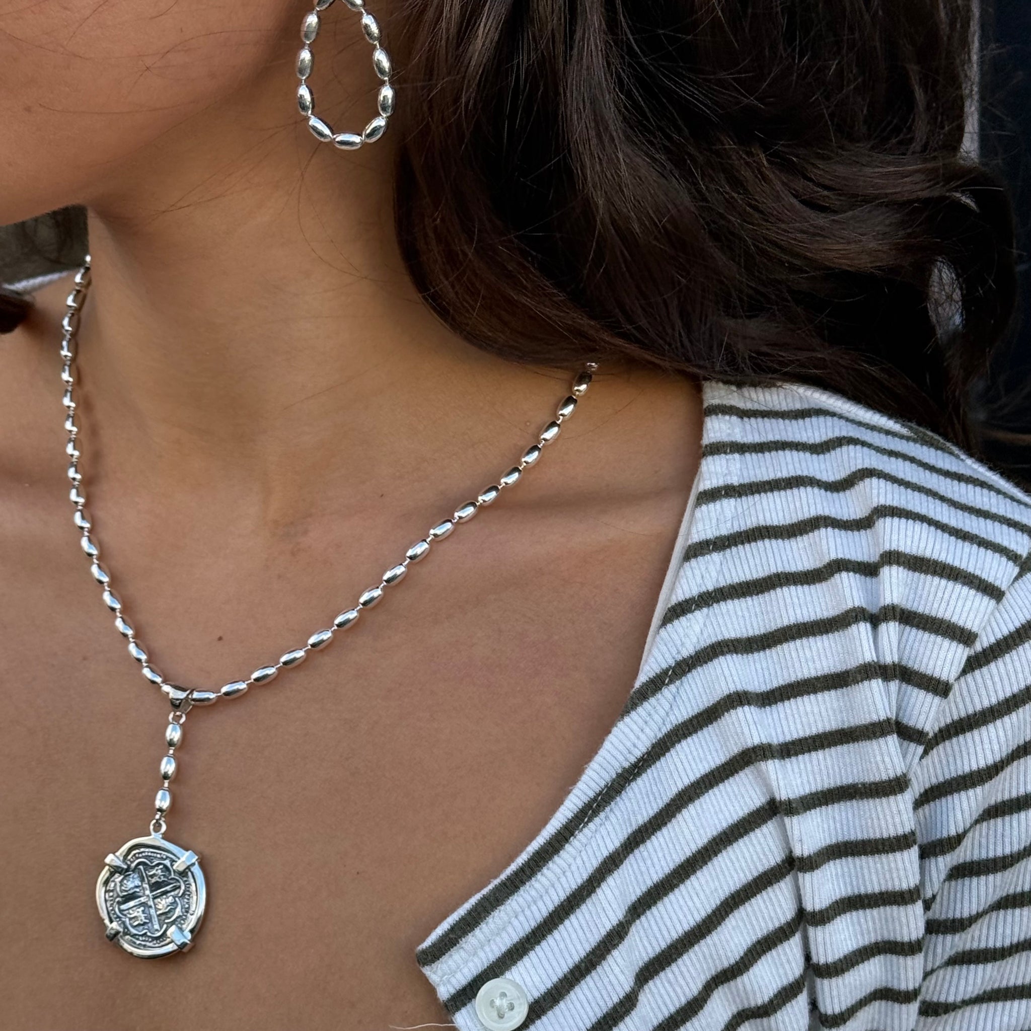 This sterling silver Rice Bead Y drop enhancer features a replica inspired by the legendary Atocha treasure coin, recovered from the Spanish galleon Nuestra Señora de Atocha, lost in 1622 and discovered centuries later. The classic Rice Bead motif paired with this historic replica coin creates a wearable piece of history, blending timeless craftsmanship with contemporary style. The signature designed Y drop is offered on an xl rice bead or large paperclip necklace.