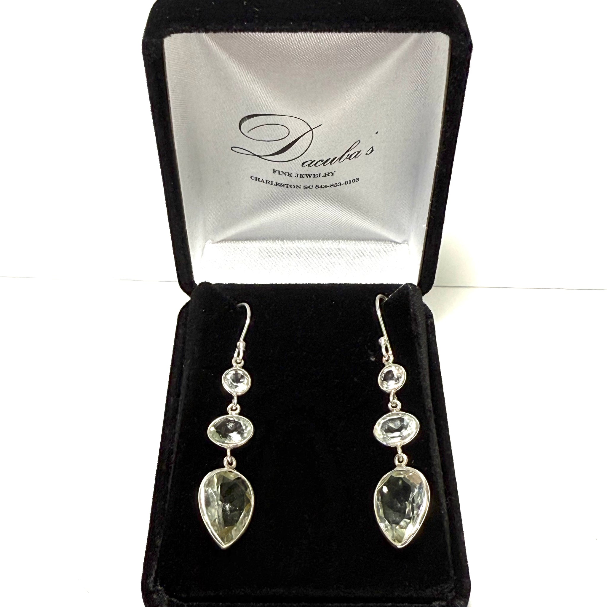 These earrings are a triple gemstone drop design, featuring beautiful green amethyst gemstones, set in a contemporary style.