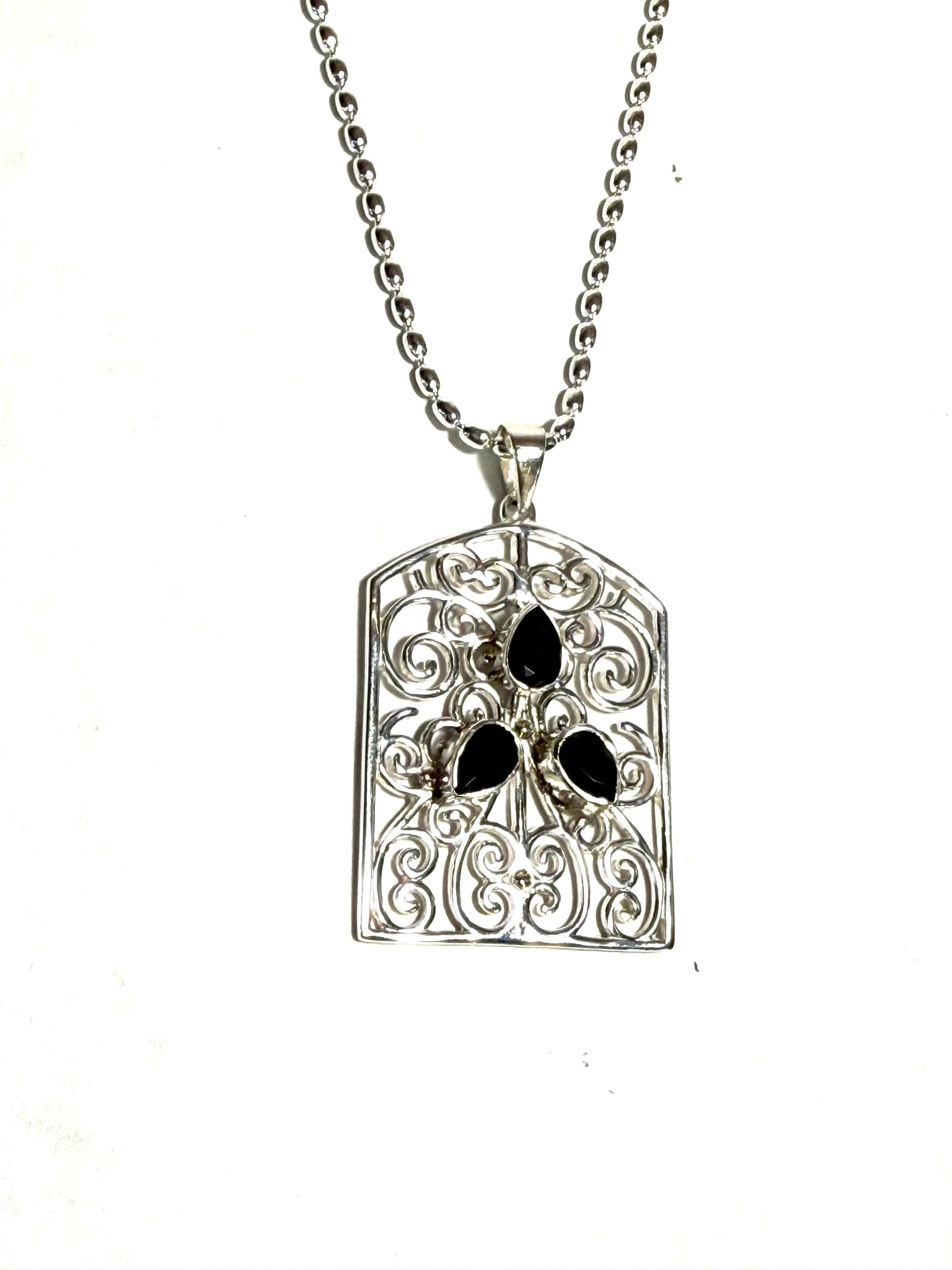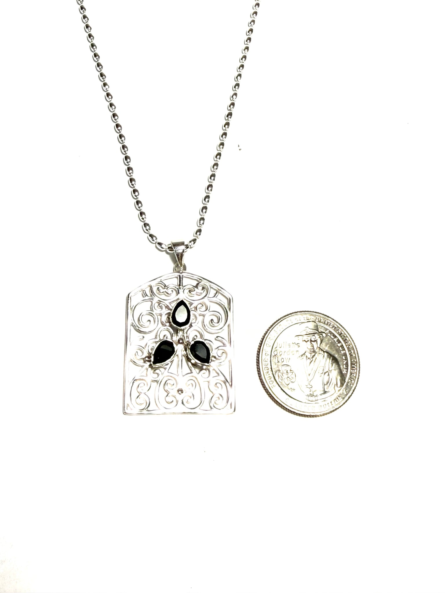 This Southern Gate & Onyx necklace showcases signature sterling silver scrollwork accented with natural Onyx gemstones. Available only at Dacuba’s Jewelry, this elevated design reflects Charleston’s historic iron gates through its timeless architectural silhouette. A refined statement piece with enduring elegance.